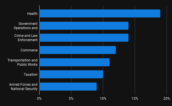 By looking at the bills sponsored by Amy, we can see the main focuses of her work while in government. Though she has vast array of experience; Health, Government operations and Crime hold majority of all of his sponsored bills.